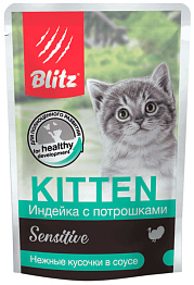 - Blitz Sensitive — для домашних питомцев, которые имеют чувствительное пищеварение и склонность к аллергии. Дополнительно корма обогащены пробиотиками, Омега-3.