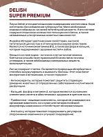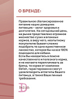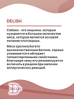 Рационы «Делиш» включают сложные углеводы, красный рис, минеральные вещества, необходимые для поддержания здоровья питомцев. В составах нет усилителей вкуса, пищевых красителей, сои и ГМО.