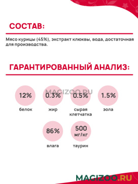 Состав: мясо курицы (45%), экстракт клюквы, вода, достаточная для производства.