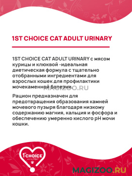 1ST CHOICE CAT ADULT URINARY с мясом курицы и клюквой -идеальная диетическая формула с тщательно отобранными ингредиентами для взрослых кошек для профилактики мочекаменной болезни.