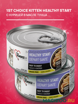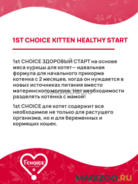 1st CHOICE ЗДОРОВЫЙ СТАРТ на основе мяса курицы для котят— идеальная формула для начального прикорма котенка с 2 месяцев, когда он нуждается в новых источниках питания вместо материнского молока. Нет необходимости разделять котенка с мамой!