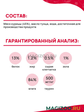 Состав: мясо курицы (45%), масло тунца, вода, достаточная для производства продукта.