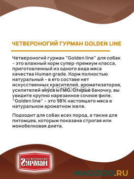Четвероногий гурман “Golden line” для собак – это влажный корм супер-премиум класса, приготовленный из одного вида мяса качества Human grade. Корм полностью натуральный – в его составе нет искусственных красителей, ароматизаторов, усилителей вкуса и ГМО. Открыв баночку, вы увидите крупно нарезанное сочное филе. “Golden line” – это 98% настоящего мяса в натуральном ароматном желе.