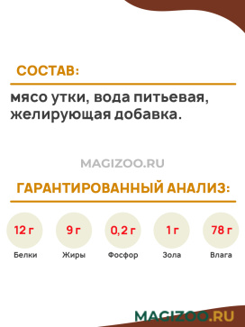 Состав: мясо утки, вода питьевая, желирующая добавка.