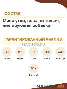 Состав: мясо утки, вода питьевая, желирующая добавка.