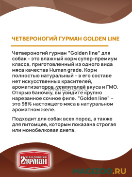 Четвероногий гурман “Golden line” для собак – это влажный корм супер-премиум класса, приготовленный из одного вида мяса качества Human grade. Корм полностью натуральный – в его составе нет искусственных красителей, ароматизаторов, усилителей вкуса и ГМО. Открыв баночку, вы увидите крупно нарезанное сочное филе. “Golden line” – это 98% настоящего мяса в натуральном ароматном желе.