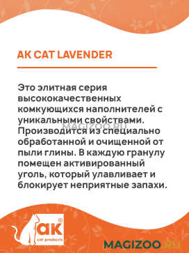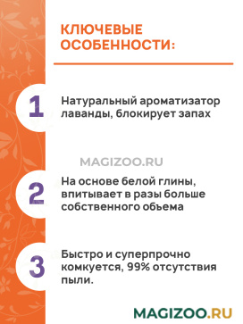 Комкующийся наполнитель на основе натуральной белой глины с добавлением активированного угля и ароматом лаванды.