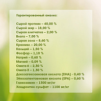 Энергетическая ценность: 3886 ккал/кг, 16,30 МДж/кг (28% от белка, 41% от жира). Белок животного происхождения: 96%.
