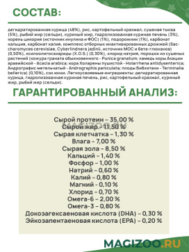 Состав: дегидратированная курица (48%), рис, картофельный крахмал, сушеная тыква (5%), рыбий жир (сельди), куриный жир, гидролизованная куриная печень (3%), корень цикория (источник инулина и ФОС) (1%), подорожник (1%), карбонат кальция, карбонат калия, комплекс отборных инактивированных дрожжей (Saccharomyces cerevisiae, Cyberlindnera jadinii, источник МОС и бета-глюканов) (0,50%), ксилоолигосахариды (X.O.S.) (0,30%), хлорид натрия, порошок из сушеных растений (кожура граната обыкновенного - Punica granatum; камедь коры Акации аравийской - Acacia arabica; кора Холарены пушистой - Holarrhena antidysenterica; Андрографис метельчатый - Andrographis paniculata; плоды Бибхитаки - Terminalia bellerica) (0,10%), сок юкки. Легкоусвояемые ингредиенты: дегидратированная курица, гидролизованная куриная печень, рис, картофельный крахмал, куриный жир, рыбий жир (сельди).