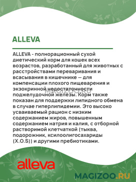 ALLEVA CARE GASTROINTESTINAL LOW FAT - полнорационный сухой диетический корм для кошек всех возрастов, разработанный для животных с расстройствами переваривания и всасывания в кишечнике — для компенсации плохого пищеварения и экзокринной недостаточности поджелудочной железы. Корм также показан для поддержки липидного обмена в случае гиперлипидемии.