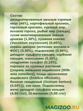 Состав: дегидратированные цельные куриные яйца (44%), картофельный крахмал, гороховый крахмал, куриный жир, волокна гороха, рыбий жир (сельди), сухие инактивированные пивные дрожжи (1,50%), сушеная клюква (Vaccinium oxycoccum) (0,60%), корень цикория (источник инулина и ФОС) (0,50%), подорожник (0,50%), дигидрат сульфата кальция, карбонат кальция, глюкозамин (0,20%), хондроитин сульфат (0,10%), порошок из сушеных растений ((корень женьшеня индийского (Withania somnifera), плоды крыжовника индийского (Emblica officinalis), базилик священный (Ocimum Santum) (0,05%)), сок юкки. Подкислитель мочи: дигидрат сульфата кальция (4,50 г/кг), DL-метионин (5,00 г/кг).