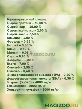 Корм также содержит комплекс растительных компонентов - фитонутриентов с высоким содержанием полифенолов, способных ограничивать окислительный стресс во всех системах организма, а экстракт мелиссы лекарственной способствует снижению возбудимости у кошек и снижению стресса, предрасполагающего к заболеваниям мочевыводящих путей.