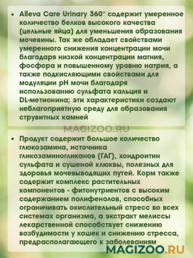 Alleva Care Urinary 360° — это полнорационный сухой диетический корм для взрослых кошек, предназначенный для растворения струвитных камней и предотвращения их рецидивов. Он также показан для поддержания здоровья мочевыводящих путей в случаях заболевания нижних отделов мочевыводящих путей кошек и кошачьего урологического синдрома.