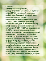 Картофельный крахмал, дегидратированные цельные куриные яйца (25%), гороховый крахмал, рыбий жир (сельди), куриный жир, волокна гороха, сухие инактивированные пивные дрожжи (1,50%), жир криля (Euphasia sp., источник ЭПК, ДГК и астаксантина) (1%), корень цикория (источник инулина и ФОС) (0,50%), подорожник (0,50%), цитрат калия, карбонат калия, порошок из сушеных растений (розмарин (Rosmarinus officinalis), куркума (Curcuma longa), гвоздика (Eugenia caryophillus), лимон (Citrus sp.)) (0,05%), сушеная водоросль Гематококк дождевой (Haematococcus pluvialis, источник астаксантина) (0,03%), сок юкки. Источники белка: дегидратированные цельные яйца. Подщелачиватели мочи: цитрат калия (4,50 г/кг), карбонат калия (4,00 г/кг).