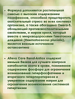Alleva Care Renal-Antiox содержит меньше белков для лучшего контроля катаболитов азота в крови, пониженное содержание фосфора для ограничения возникновения гиперфосфатемии и вторичного гиперпаратиреоза и умеренное содержание натрия для ограничения возникновения системной гипертензии.