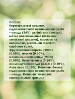Картофельный крахмал, гидролизованная океаническая рыба – сельдь (34%), рыбий жир (сельди), масло подсолнечника (источник линолевой кислоты), порошок из целлюлозы, дикальций фосфат, карбонат калия, фруктоолигосахариды (ФОС) (0,50%), инулин (0,50%), маннанолигосахариды (МОС) (0,50%), бета-глюканы (0,50%), ксилоолигосахариды (X.O.S.) (0,30%), Алое вера (0,10%). Источник белков: гидролизованная океаническая рыба – сельдь. Источник углеводов: картофельный крахмал.
