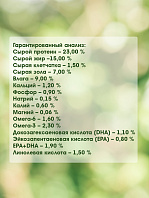 Энергетическая ценность: 3840 ккал/кг, 16,1 МДж/кг (23% от белка, 39% от жира). Белок животного происхождения: 99%.