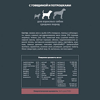 Свежее мясо и рыба 20 % (говядина, говяжьи субпродукты, хамса, курица), дегидрированное мясо птицы 19 % (курица, индейка), ячмень, рис 13 %, животный жир, сушеная мякоть сахарной свеклы, желтый горошек, яблоко, гидролизованная куриная печень, витаминно-минеральная смесь, картофель, морковь, пивные дрожжи, комплекс AlphaPetBIO (зеленогубый моллюск, одуванчик, льняное семя, розмарин, цикорий, томаты, Юкка Шидигера), рыбий жир, DL-метионин, антиоксидант.
