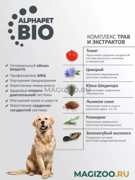 AlphaPetBIO - это комплекс компонентов для поддержания естественной микрофлоры кишечника, оптимального обмена веществ, иммунных свойств организма и здоровья опорно-двигательной системы. В его состав входят зеленогубый моллюск, календула, одуванчик, льняное семя, цикорий, клюква, юкка Шидигера, розмарин.