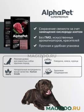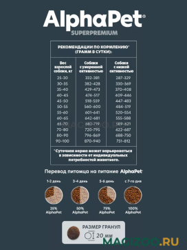 AlphaРet Superpremium — выбор владельцев, которые хотят быть уверены в том, что дают своему питомцу лучшее из возможного: натуральные отборные ингредиенты, высокое содержание животного белка и свежее мясо в основе состава. AlphaPet Superpremium ставит точку в споре о том, чем кормить питомца.