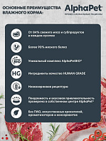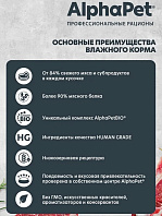 AlphaРet Superpremium — выбор владельцев, которые хотят быть уверены в том, что дают своему питомцу лучшее из возможного: натуральные отборные ингредиенты, высокое содержание животного белка и свежее мясо в основе состава. AlphaPet Superpremium ставит точку в споре о том, чем кормить питомца.