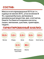 Добавленные вещества: магний - 0,08%, медь - 8мг/кг, железо - 86,4 мг/кг, марганец - 5,4 мг/кг, цинк - 140 мг/кг, йод - 1,4 мг/кг, селен - 330 мкг/кг, витамин А - 10 000 МЕ/кг, витамин D – 1 200 МЕ/кг, витамин Е - 80 МЕ/кг, витамин В1 - 4 мг/кг, витамин В2 - 5 мг/кг, витамин B6 - 2,74 мг/кг, ниацин - 44 мг/кг, пантотеновая кислота – 14,2 мг/кг, холин – 2 800 мг/кг, биотин - 180 мкг/кг, фолиевая кислота - 824 мкг/кг, хондроитин - 100 350 мкг/кг, глюкозамин - 28 670 мкг/кг, DL-метионин+цистеин – 8,8г.