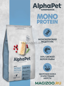 Сухой полнорационный монобелковый корм Alphapet Superpremium Monoprotein для взрослых кошек с белой рыбой.