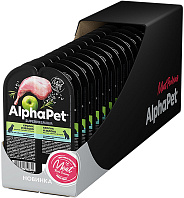 Мясные кусочки: свежее мясо и субпродукты - 86% (в том числе кролик, говядина, курица), яблоко, рис, витаминно-минеральная смесь, комплекс AlphaPetBIO® (зеленогубый моллюск, одуванчик, льняное семя, розмарин, цикорий, томаты, юкка Шидигера).