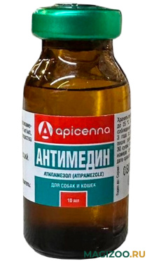 Антимедин быстро всасывается после внутримышечной инъекции. Максимальная концентрация препарата в крови достигается за 10 – 15 минут. Период полувыведения атипамезола от 1 до 3 часов. Атипамезол окисляется в основном в печени, малая часть метилируется в почках. Метаболиты препарата выводятся главным образом с мочой. Антимедин по степени воздействия на организм относится к малоопасным веществам (4 класс опасности по ГОСТ 12.1.007), в рекомендуемых дозах хорошо переносится животными, не обладает эмбриотоксическими, тератогенными и гепатотоксическими свойствами.