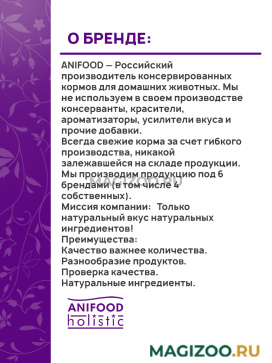 ANIFOOD — Российский производитель консервированных кормов для домашних животных. Мы не используем в своем производстве консерванты, красители, ароматизаторы, усилители вкуса и прочие добавки.