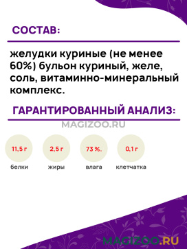 Состав: желудки куриные (не менее 60%) бульон куриный, желе, соль, витаминно-минеральный комплекс.