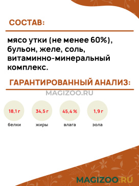 Состав: мясо утки (не менее 60%), бульон, желе, соль, витаминно-минеральный комплекс.
