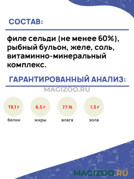 Состав: филе сельди (не менее 60%), рыбный бульон, желе, соль, витаминно-минеральный комплекс.
