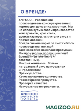 ANIFOOD — Российский производитель консервированных кормов для домашних животных. Мы не используем в своем производстве консерванты, красители, ароматизаторы, усилители вкуса и прочие добавки.