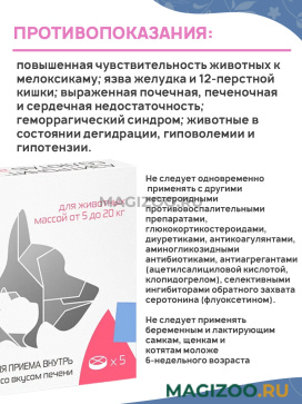 Противопоказания: повышенная чувствительность животных к мелоксикаму; язва желудка и 12-перстной кишки; выраженная почечная, печеночная и сердечная недостаточность; геморрагический синдром; животные в состоянии дегидрации, гиповолемии и гипотензии.