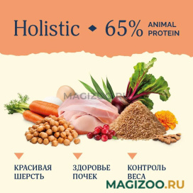 - Гипоаллергенный – один вид мяса в составе, отсутствие курицы и глютена минимизирует риск развития аллергической реакции у питомца.