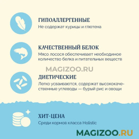 - Качественный белок – лосось – альтернативный источник животного белка, идеально подходит для чувствительного пищеварения.