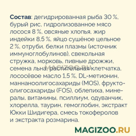 Дегидрированная рыба – 30 %, бурый рис, гидролизованное мясо лосося - 8 %, овсяные хлопья, жир индейки - 8,5 %, яйцо сушеное цельное - 2 %, отруби, белки плазмы (источник иммуноглобулинов), свекольная стружка, морковь, пивные дрожжи, семена льна, растительная клетчатка, лососевое масло - 1,5 %, DL-метионин, маннаноолигосахариды (MOS), фруктоолигосахариды (FOS), облепиха, минералы, витамины, псиллиум, одуванчик, хлорелла, таурин, гемоглобин, экстракт юкки Шидигера, смесь токоферолов и экстракта розмарина.