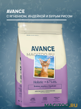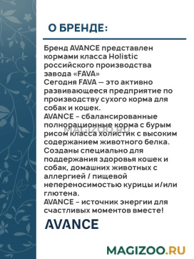 AVANCE – сбалансированные полнорационные корма с бурым рисом класса холистик с высоким содержанием животного белка. Созданы специально для поддержания здоровья кошек и собак, домашних животных с аллергией / пищевой непереносимостью курицы и/или глютена.