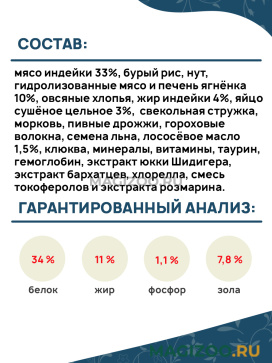 Состав: дегидрированное мясо индейки 33%, бурый рис, нут, гидролизованные мясо и печень ягнёнка 10%, овсяные хлопья, жир индейки 4%, яйцо сушёное цельное 3%, белки плазмы (источник иммуноглобулинов), свекольная стружка, морковь, пивные дрожжи, гороховые волокна, семена льна, лососёвое масло 1,5%, DL-метионин, растительная клетчатка, маннаноолигосахариды (MOS), фруктоолигосахариды (FOS), L-цистеин, клюква, минералы, витамины, таурин, гемоглобин, экстракт юкки Шидигера, экстракт бархатцев, хлорелла, смесь токоферолов и экстракта розмарина.