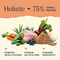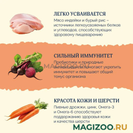 - Гипоаллергенный – один вид мяса в составе, отсутствие курицы и глютена минимизирует риск развития аллергической реакции у питомца.