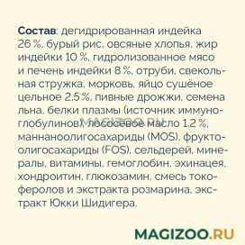 Дегидрированная индейка – 26 %, бурый рис, овсяные хлопья, жир индейки – 10 %, гидролизованное мясо и печень индейки – 8 %, отруби, свекольная стружка, морковь, яйцо сушёное цельное - 2,5 %, пивные дрожжи, семена льна, белки плазмы (источник иммуноглобулинов), лососевое масло - 1,2 %, маннаноолигосахариды (MOS), фруктоолигосахариды (FOS), сельдерей, минералы, витамины, гемоглобин, эхинацея, хондроитин, глюкозамин, смесь токоферолов и экстракта розмарина, экстракт юкки Шидигера.