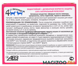 Ошейник репеллентный «Четыре с хвостиком» применяют кошкам для защиты от блох, вшей, власоедов, комаров, иксодовых и чесоточных клещей. После вскрытия упаковки ошейник надевают на животное, подгоняя по размеру так, чтобы между шеей и ошейником оставался промежуток в 1 см, затем пропускают свободный конец ленты через фиксатор, а излишек ленты отрезают, оставляя конец 1,5-2 см.