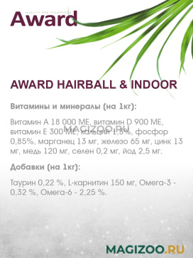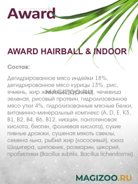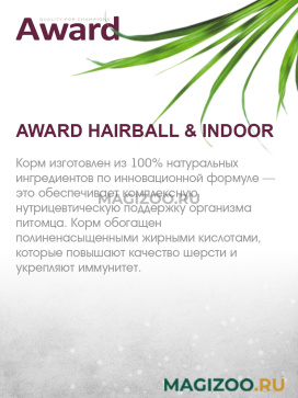Сухой корм AWARD Hairball & Indoor для взрослых кошек для выведения шерсти с уткой и индейкой с добавлением зеленой чечевицы и Юкки Шидигера.