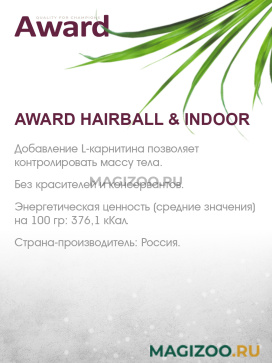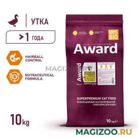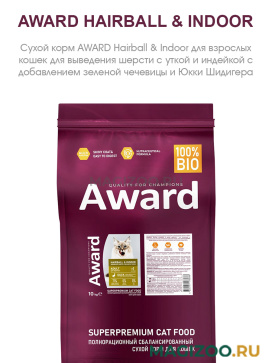 Сухой корм AWARD Hairball & Indoor для взрослых кошек для выведения шерсти с уткой и индейкой с добавлением зеленой чечевицы и Юкки Шидигера.