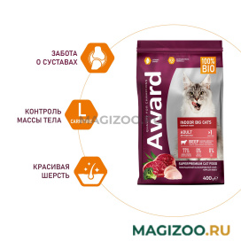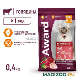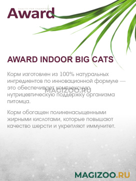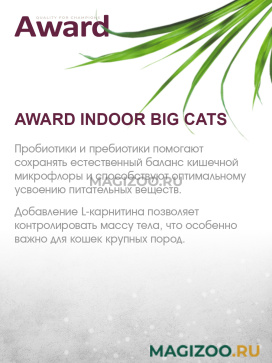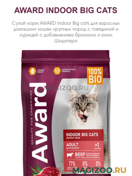 Сухой корм AWARD Indoor Big cats для взрослых домашних кошек крупных пород с говядиной и курицей с добавлением брокколи и юкки Шидигера.