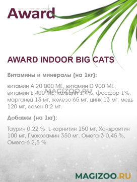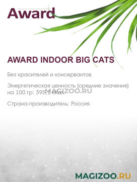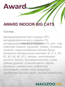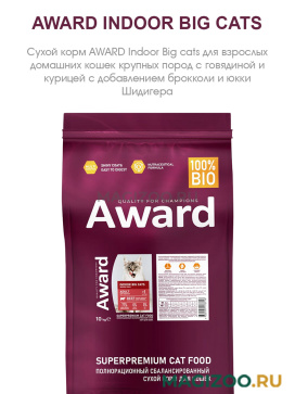 Сухой корм AWARD Indoor Big cats для взрослых домашних кошек крупных пород с говядиной и курицей с добавлением брокколи и юкки Шидигера.