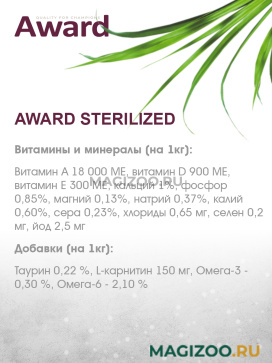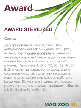 AWARD - это не просто корм, это функциональные рецептуры, которые работают. Выбирая AWARD, Вы выбираете осознанный подход к питанию Вашего питомца!