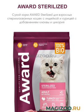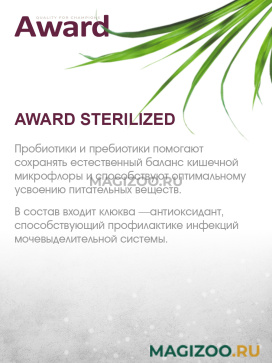 Сухой корм AWARD Sterilized для взрослых стерилизованных кошек с индейкой и курицей с добавлением клюквы и цикория.