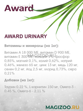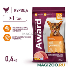 Сухой корм AWARD Urinary для взрослых кошек для профилактики мочекаменной болезни с курицей с добавлением клюквы, цикория и рыбьего жира.